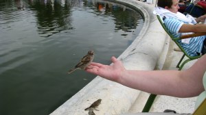 Lunch varied depending on what we were doing. A few times we stopped at one of numerous places that sold sandwiches to go. Other times we enjoyed a relaxing meal at a sandwich shop that had seating or a bistro with lunch specials. The sandwiches that we ordered to go were fairly standard. Always on a baguette, though, thinner and shorter than the ones I see in our grocery stores. Most commonly they were filled with meat and cheese, though you could get just meat (salami, ham, chicken) or just cheese (goat, mozza, roquefort, etc). They even had sandwiches filled with a very long hotdog with melted cheese. The sandwich shop by our hotel offered a combo where for 5.50 Euros bought us a sandwich, water or pop and cookies. The sandwiches were a good size and we often purchased two combos to split between the four of us. If we wanted, we could even buy inexpensive bottles of wine for 3 – 6 Euros to go with our lunch. The sandwiches were a great way to have lunch, especially when we stopped at Jardin de Tuilleries to have a seat, eat and feed the birds. The pic below shows a sparrow sitting on my hand.