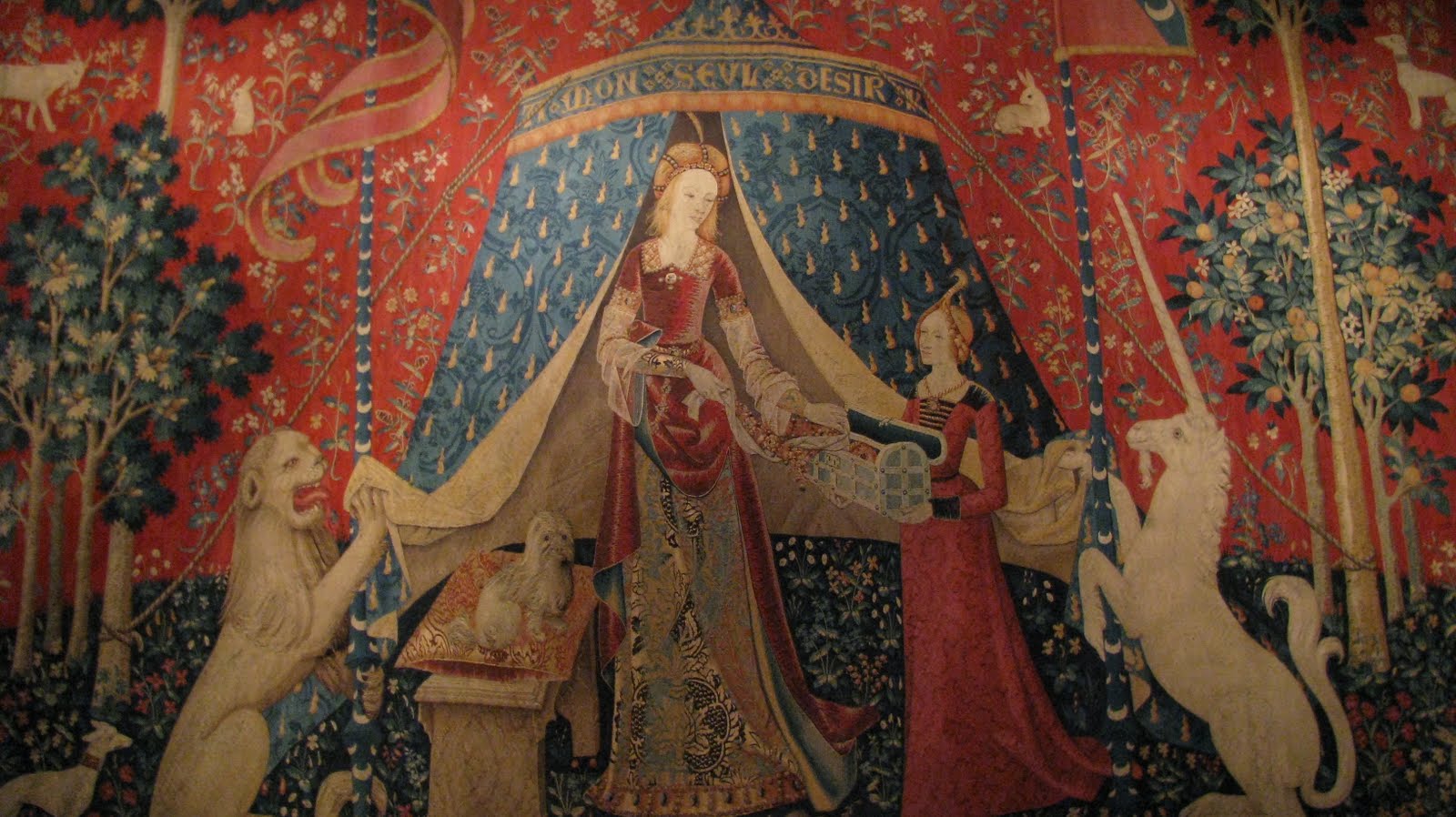 Let’s move onto the Latin Quarter. There is so much to enjoy in the Latin Quarter. Walking around the Sorbonne, Paris’ world-reknown university. Watching the sun set over the Pantheon. Shopping in all the little boutiques and shops. Enjoying a delicious meal at one the numerous restaurants. Finally, a great treasure of the Latin Quarter: The Cluny Museum (a.k.a. National Museum of the Middle Ages), home of the medival tapestry The Lady and The Unicorn. This set of six tapestries is considered the greatest work of art of Europe’s middle ages. I learned of them years ago in college and have wanted to see them ever since. They truly are beautiful.