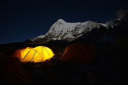 Photo credit: Iamthanes, Lit Tents of Seven Summit Treks seen at Everest Basecamp, background Nuptse mountain., CC BY-SA 4.0